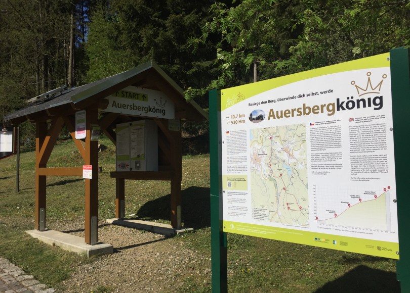 Im Erzgebirge am Fuß des Blauenthaler Wasserfalls startet eine 10,7km lange ausgewiesene Strecke hinauf zum Auersberg (1.019 m ü. NN). Insgesamt sind 530 Höhenmeter zu überwinden. Startberechtigt sind Biker, E-Bikes, Skater, Läufer und auch Walker. Jeder Teilnehmer startet individuell im Zeitraum Mai bis Oktober. Denn dann sind die zwei Stempelstellen am Start und im Ziel aktiv. Gestempelt wird Uhrzeit vom Start und vom Ziel. Dort kann man seine Teilnahme dann auch per Briefkasten abgeben.